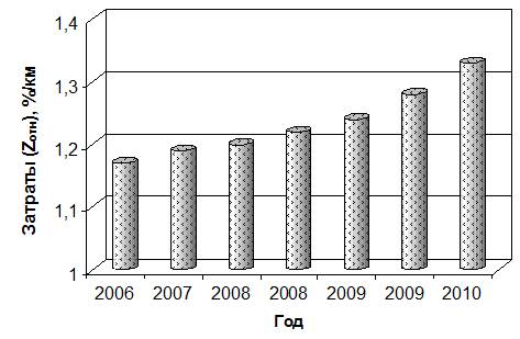 Необходимость сокращения общей продолжительности и стоимости возведения технологических проездов и площадок при капитальном ремонте ЛЧ МГ обуславливается анализом данных по капитальному ремонту линейной части системы магистральных газопроводов ООО "Газпром трансгаз Волгоград" (Фроловское ЛПУ, Усть-Бузулукское ЛПУ, Калачеевское ЛПУ и Бубновское ЛПУ), на которых производство строительно-монтажных работ было выполнено предприятием ООО "Передвижная механизированная колонна № 4" (рис. 1, где Z [%/км] - затраты в % к общей стоимости производства СМР): МГ Средняя Азия - Центр 4-2 (Dн = 1220 мм, Lу = 10,0 км, соответственно, Dн, Lу - диаметр и протяженность участка); МГ Средняя Азия - Центр 3 (Dн = 1220 мм, Lу = 13,0 км); МГ Средняя Азия - Центр 4-1 (Dн = 1220 мм, Lу = 22,0 км); МГ Средняя Азия - Центр 4-2 (Dн = 1220 мм, Lу = 26,0 км); МГ Средняя Азия - Центр 4-1 (Dн = 1220 мм, Lу = 12,0 км); МГ Уренгой - Новопсков (Dн = 1420 мм, Lу = 26,0 км); МГ Средняя Азия - Центр 4-2 (Dн = 1220 мм, Lу = 20,0 км).