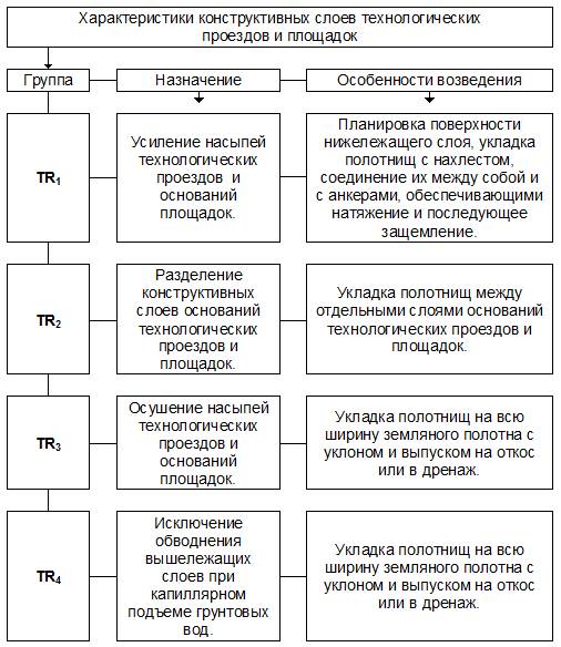В последнее время синтетические материалы начали применяться при возведении технологических проездов и площадок на слабонесущих грунтах, что позволило значительно сократить расход древесины, снизить эксплуатационные затраты, уменьшить трудоемкость работ по сравнению с грунтово-лежневыми технологическими проездами. Существующие технические решения по конструкции насыпей технологических проездов и площадок можно разделить на четыре группы, краткая характеристика которых приведена на рис. 2, где TR1 - армирующие прослойки, TR2 - разделительные прослойки, TR3 - дренирующие прослойки, TR4 - капилляро-прерывающие слои. Они могут применяться для возведения технологических проездов и площадок с покрытиями различных типов в нормальных условиях, на болотах, многолетнемерзлых, переувлажненных и слабонесущих грунтах. Основными недостатками таких конструкций являются значительная деформируемость и низкая несущая способность.