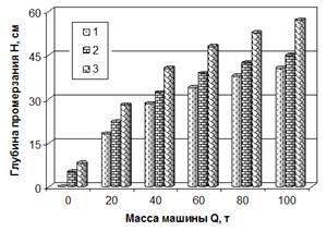 Рис. 3. Зависимость необходимой глубины промерзания болота от массы машин при различных значениях коэффициента a: 1 - a = 4,6; 2 - 2,0; 3 - 1,6 |