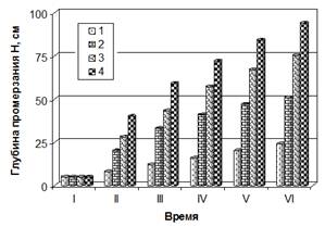 Рис. 4. Зависимость глубины промерзания болот от календарного времени: 1 - W = 40% при высоте снежного покрова 1,5 м; 2 - W = 40% в естественном состоянии; 3 - W = 40% без снега; 4 - W = 80% без снега |