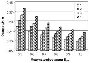 Рис. 7. Зависимость величины осадки технологического проезда (DH) от относительного модуля деформации резинотканевого материала (Eотн) при различных значениях H: 1 - H = 0,6 м; 2 - 0,8 м; 3 - 1,0 м; 4 - 1,2 м |