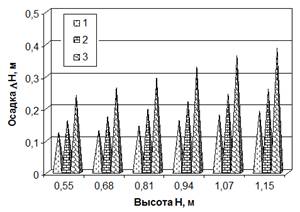 Рис. 8. Зависимость величины осадки насыпи технологического проезда (DH) от высоты (H) при различных значениях относительного модуля деформации резинотканевого материала (Eотн): 1 - Eотн = 0,5×E0; 2 - 0,75×E0; 3 - 1,0×E0 |