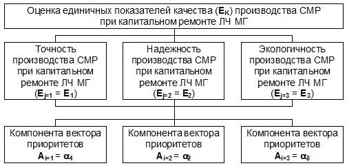 Комплексный показатель качества производства СМР при капитальном ремонте ЛЧ МГ определяется в виде линейной зависимости (Е1, Е2, ... , Еn - единичные показатели качества, ai ³ 0 - эмпирические коэффициенты):