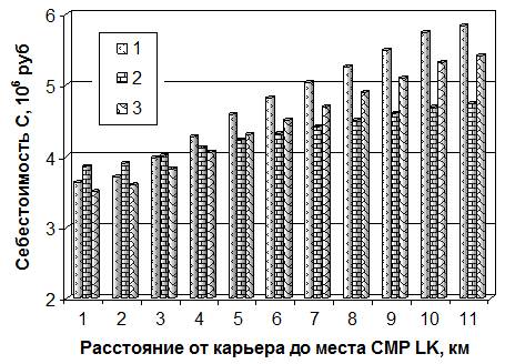 Рис. 12. Зависимость себестоимости возведения технологического проезда от дальности возки грунта для возведения насыпи: 1 - проезд грунтового типа; 2 - проезд дерево-грунтового типа; 3 - проезд с использованием синтетических материалов