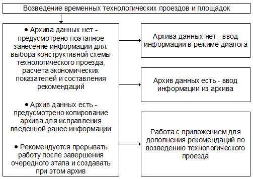 Реализация ППП ТЭО <возведение временных технологических проездов и площадок> предполагает выполнение экспертом определенной последовательности действий, направленных на получение в конечном итоге документа рекомендательного характера. Для получения результата пользователь выбирает одну из следующих клавиш: <архива данных нет> - ввод информации в режиме диалога, предусмотрено поэтапное занесение информации для выбора конструктивной схемы дороги, расчета экономических показателей и составления рекомендаций; <архив данных есть> - ввод информации из архива, предусмотрено копирование архива для исправления введенной ранее информации; <работа с приложением для дополнения рекомендаций по строительству временных дорог и технологических проездов>. Рекомендуется прерывать работу после завершения очередного этапа и создавать при этом архив.