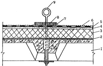 1 - сборная железобетонная плита покрытия; 2 - пароизоляция (по расчету); 3 - теплоизоляция; 4 - выравнивающая стяжка; 5 - основной водоизоляционный ковер; 6 - защитный слой; 7 - рамка из уголка; 8 - герметизирующая мастика; 9 - анкер