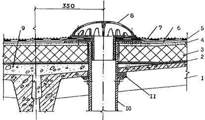 1 - сборная железобетонная плита покрытия: 2 - пароизоляция (по расчету); 3 - теплоизоляция; 4 - выравнивающая стяжка; 5 - основной водоизоляционный ковер; 6 - дополнительный водоизоляционный ковер; 7 - защитный слой; 8 - колпак водоприемной воронки; 9 - легкий бетон выравнивающего слоя ендовы; 10 - водоприемная чаша; 11 - уплотнитель