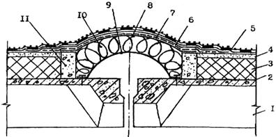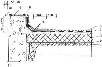 1 - сборная железобетонная плита покрытия; 2 - пароизоляция; 3 - теплоизоляция; 4 - выравнивающая стяжка; 5 - основной водоизоляционный ковер; 6 - рулонный водоизоляционный материал, уложенный насухо; 7 - стеклоткань: 8 - оцинкованная кровельная сталь; 9 - компенсатор; 10 - утеплитель (минеральная вата); 11 - бортик из легкого бетона;