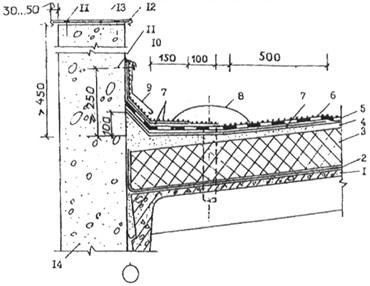 1 - сборная железобетонная плита покрытия; 2 - пароизоляция (по расчету); 3 - теплоизоляция; 4 - выравнивающая стяжка; 5 - основной водоизоляционный ковер; 6 - защитный слой; 7 - дополнительный водоизоляционный ковер; 8 - воронка внутреннего водостока; 9 - фартук; 10 - герметизирующая мастика; 11 - дюбели; 12 - оцинкованная кровельная сталь; 13 - костыли 40´4 через 600 мм, 14 - стена