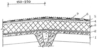 1 - железобетонная плита покрытия; 2 - пароизоляция; 3 - теплоизоляция; 4 - цементно-песчаная стяжка; 5 - основной водоизоляционный ковер; 6 - защитный слой; 7 - дополнительный водоизоляционный ковер;