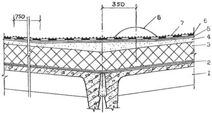 1 - железобетонная плита покрытия; 2 - пароизоляция; 3 - теплоизоляция; 4 - цементно-песчаная стяжка; 5 - дополнительный водоизоляционный ковер; 6 - основной водоизоляционный ковер; 7 - защитный слой; 8 - воронка внутреннего водостока