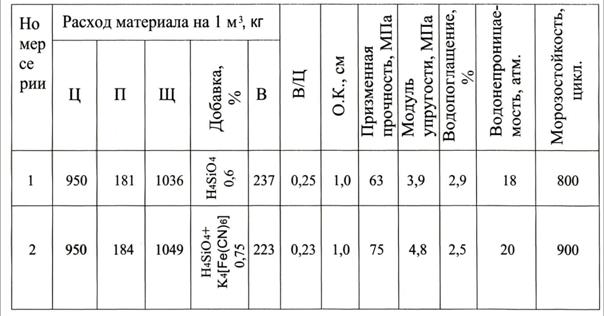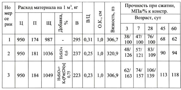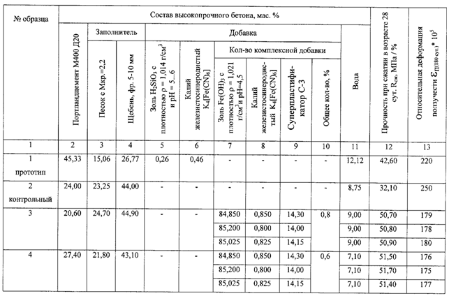 Заявляемая совокупность существенных признаков проявляет новое свойство в присутствии комплексной добавки, представленной золем гидрооксида железа (III) Fe(ОН)3 с плотностью равной 1,021 г/см3, рН 4,5, гексоцианоферратом (II) калия К4[Fe(CN)6] и суперпластификатором С-3, а именно уменьшает водопотребность сырьевой смеси на 23%, повышает прочность при сжатии в проектном возрасте на 61%, до значения 51,70 МПа, понижает относительную деформацию ползучести на 30%, до значения п(180cyт)=175*10-5 по сравнению с контрольным бездобавочным составом (См. табл.1).