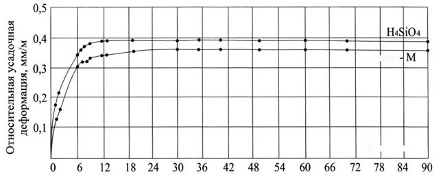 Рис. 1 Характеристики усадочной деформации высокопрочного бетона с добавками на основе золя Н4SiO4