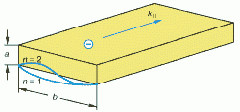 Волна, соответствующая свободному электрону в твердом теле, может беспрепятственно распространяться в любом направлении. Ситуация кардинально меняется, когда электрон попадает в твердотельную структуру, размер которой L, по крайней мере в одном направлении, ограничен и по своей величине сравним с длиной электронной волны. На рис. 4 такая ситуация проиллюстрирована на примере квантового шнура, у которого ограничены размеры сечения a и b. В этих направлениях возможно распространение только волн с длиной, кратной геометрическим размерам структуры. Разрешенные значения волнового вектора для одного направления задаются соотношением k=2π/ λn=nπ/L (n = 1, 2, 3,...), где L в соответствии с рис. 4 может принимать значения, равные a или b. Для соответствующих им электронов это означает, что они могут иметь только определенные фиксированные значения энергии, то есть имеет место дополнительное квантование энергетических уровней. Это явление получило название квантового ограничения. Вдоль же шнура могут двигаться электроны с любой энергией.