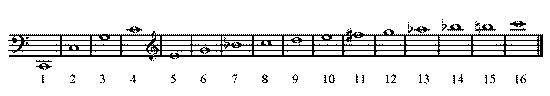 До большой октавы здесь основной тон, звуки под цифрами 2 – 16 обертоны. Звучание обертоновых звуков применяется на медных духовых инструментах, на струнных инструментах для извлечения так называемых флажолетных звуков.