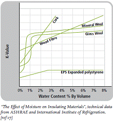 EPS – пенополистирол, glass wool – стекловата, mineral wool – минеральная вата, wood fibre – древесина, cork – кора. По вертикали K-value – теплопроводность, по горизонтали – содержание воды в % от объема