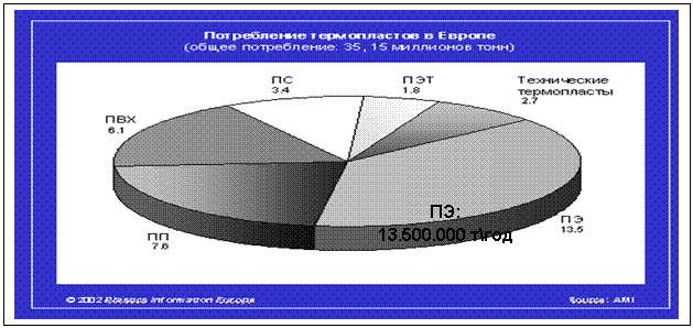 Диаграмма «Объёмы потребления термопластов в Европе и их соотношение в 2003 г.» (Источник: «AMI Consulting»)