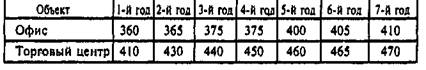 Предполагается, что стоимость офисного здания будет расти на 5 % в год в течение 7-летнего владения, а стоимость торгового центра - на 3 % в год.