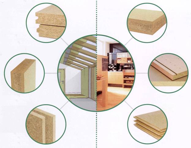 Экологически чистые плиты, не содержат формальдегида, фенола, плотность 250 – 650 кг/м3, толщина 12-120 мм, возможен различный формат, подходят к любому типу отделки.