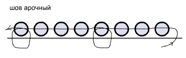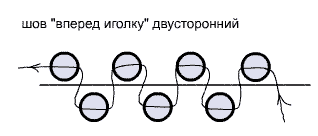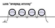 Шов похож на шов "Вперед иголку", с той лишь разницей, что изнаночный стежок делается подлиннее и на него также нанизывается бисерина.