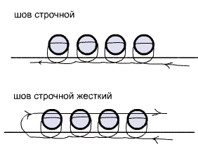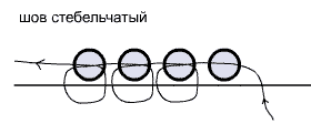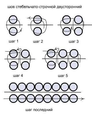 Этот шов получается из двух вышеописанных швов: строчного и стебельчатого. При этом способе шитья вышивка получается жесткая. На рисунке изображен порядок работы: