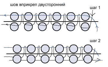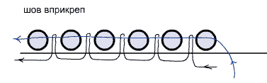Для шитья вприкреп бисер сначала нанизывают на нитку, которую затем пришивают к ткани короткими стежками между бусинами. Шитье вприкреп позволяет быстро изготовить изделия из бисера, не случайно североамериканские индейцы дали этому способу шитья название "Ленивая жена". Уложите нить с бисером на ткань. Другой нитью пришейте низку бисера через каждую бусину (см. рисунок) или через 2-3 бисерины.