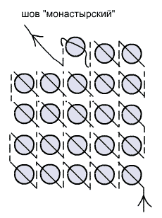 На каждый стежок на лицевой стороне нанизывается по одной бисеринке, делается диагональный стежок и нить уходит на изнанку близко к бусине. На изнанке делается вертикальный стежок, нить снова выходит на лицевую сторону и делается еще один диагональный стежок с бисеринкой. Таким образом, с лицевой стороны получаются диагональные стежки с нанизанными на них бисеринками, а с изнаночной стороны стежки вертикальные.