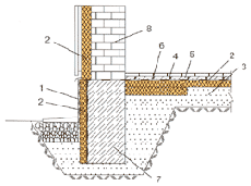 Весьма перспективным материалом для теплоизоляции полов является экструдированный пенополистирол (рис. 1). Благодаря своей закрытоячеистой структуре, этот материал отличается продолжительным сроком службы и обеспечивает эффективное и экономичное решение проблемы теплоизоляции полов, подвергающихся различным нагрузкам в процессе эксплуатации при выполнении различных функций. Он с успехом применяется для теплоизоляции полов первых этажей, подвальных помещений, а также промежуточных этажей. Теплоизоляция полов первых этажей Несмотря на всю надежность теплоизоляции пола, она окажется недостаточной без столь же надежной теплоизоляции сопрягаемых с полом подвальных стен, цоколя и других конструкций. Теплоизоляция подземных конструкций приобретает особое значение при наличии в районе строительства водоносных слоев и грунтовых вод. С учетом чрезмерного воздействия влаги, низких температур и механических нагрузок исключительно важным становится выбор оптимального для каждого конкретного случая теплоизоляционного материала. Плиты экструдированного пенополистирола обеспечивают технически безупречное решение проблемы теплоизоляции стен подвальных помещений и защиты гидроизоляционной мембраны. В силу своей закрытоячеистой структуры плиты из экструдированного пенополистирола не впитывают влагу и обладают исключительно высокой прочностью на изгиб и сжатие. В результате чего их можно класть под гидроизоляционные мембраны на жесткое основание из крупного щебня с выравнивающим слоем из песка. Не рекомендуется устройство подстилающего слоя толщиной менее 10 см. Такое решение устраняет необходимость использования бетонной подготовки. Находясь на теплой стороне теплоизоляционных плит, мембрана служит также в качестве пароизоляционного слоя. С точки зрения строительной физики такая конструкция значительно превосходит конструкции традиционного типа. Толщина распределительной плиты, служащей также основой для чистого пола, должна быть не меньше 8 см. Полоса из эластичного материала, уложенная вдоль линии сопряжения стены и пола, не только является уплотнением температурного шва, но также улучшает звуко - и виброизоляцию. Укладка битумной гидроизоляционной мембраны поверх теплоизоляции производится методом холодного склеивания, при этом в составе адгезива не должно быть органических растворителей и пластификаторов. В случае умеренной влажности грунта и умеренного испарения влаги из него, а также в зависимости от функционального значения здания, для разделительного слоя достаточно одного-двух слоев толстой полиэтиленовой пленки, с минимальным нахлестом 15 см. Теплоизоляция полов подвальных помещений При строительстве на влажном грунте, а также в зависимости от назначения зданий и величин нагрузок, теплоизоляция полов отапливаемых подвальных помещений осуществляется по схеме, принятой для несущих полов первых этажей. При наличии давления, создаваемого грунтовыми водами, а также в зависимости от нагрузок, создаваемых стенами и колоннами, теплоизоляционные плиты из экструдированного пенополистирола можно размещать как над, так и под железобетонными плитами, уложенными на щебне. При укладке плит из экструдированного пенополистирола под бетонными плитами фундамента и при теплоизоляции стен подва