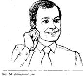 Фактически этот жест вызван желанием слушающего отгородиться от слов, положив руку около или сверху уха. Этот жест является взрослой усовершенствованной модификацией жеста маленького ребенка, когда он затыкает уши, чтобы не выслушивать упреков родителей. Другими вариантами прикосновения к уху является потирание ушной раковины, сверление в ухе (кончиком пальца), потягивание мочки уха или сгибание уха в попытке прикрыть им слуховое отверстие. Этот последний жест говорит о том, что человек наслушался вдоволь и хочет, возможно, высказаться.