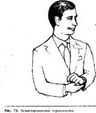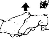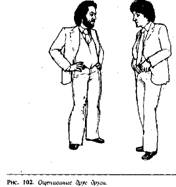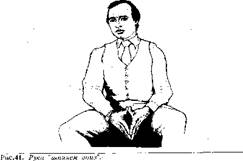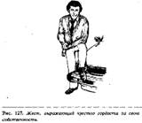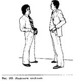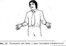 Когда ладонь повернута вниз, в вашем жесте немедленно появится оттенок начальственности. У человека, которому вы адресовали свою просьбу, появится ощущение, что он получил приказ передвинуть коробку, и может даже возникнуть чувство враждебности к вам, в зависимости от ваших с ним взаимоотношений. Например, если это ваш коллега одинакового с вами положения, то он может не выполнить вашу просьбу, но если бы вы его попросили с другим жестом, когда ладонь смотрит вверх, то он бы это сделал. Если человек, которому вы адресуете свою просьбу, ваш подчиненный, то он выполнит ее без возражений, потому что в таком случае вы имеете право использовать этот жест. На рис. изображен перстоуказующий жест. Пальцы руки сжаты в кулак, и вместе с выставленным указательным пальцем вся конфигурация становится похожей на своеобразную дубинку, с помощью которой человека принуждают к подчинению. Жест "указующего перста" является одним из наиболее раздражающих, используемых человеком в процессе речи, особенно если он совпадает по смыслу со сказанными словами.