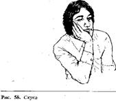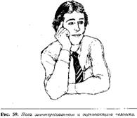 Главным здесь является жест "подпирание щеки указательным пальцем", в то время как другой палец прикрывает рот, а большой палец лежит под подбородком. Следующим подтверждением того, что слушающий относится к вам критически, является то, что ноги его крепко скрещены, а вторая рука лежит поперек тела, как бы защищая его, а голова и подбородок наклонены (враждебно). Это невербальное предложение говорит вам приблизительно следующее: "Мне не нравится, что вы говорите, и я с вами не согласен".