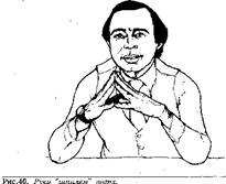 Этот жест характерен для людей таких специальностей как бухгалтеры, юристы, управляющие по вопросам торговли, управляющие банками или для уверенных в себе людей с чувством превосходства над другими: Если бы вы могли читать его мысли, вы бы прочитали: "Я все знаю" или "Может быть когда-нибудь вы будете таким же преуспевающим, как я" или даже "Я контролирую ситуацию". Этот жест характерен также для "всезнаек", и многие люди раздражаются, когда кто-нибудь демонстрирует этот жест перед ними.
