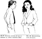 Мужчина начинает прихорашиваться при виде женщины, которая ему 'нравится, аналогичным образом с тем, как это происходит у животных. В дополнение к тем автоматическим психологическим реакциям, о которых мы уже говорили, появятся новые жесты - руки его потянутся к шее, чтобы направить галстук. Если он не носит галстук, он может поправить воротничок или смахнуть несуществующую пыль с плеча, поправить запонки, рубашку, пиджак или другой предмет туалета. Он может также пригладить волосы, чтобы выглядеть привлекательнее.