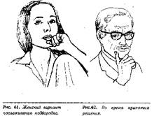 Этот жест "поглаживания подбородка" означает, что человек пытается принять решение. Если человек носит очки, то вслед за оценочными жестами для принятия решения он проделает следующее: он снимет очки и заложит одну дужку очков в рот, вместо поглаживания подбородка. Курильщик поместит трубку в рот. Если человек после того, как его попросили сообщить о своем решении, берет в рот ручку или палец; это признак того, что он не уверен в себе, и ему необходима поддержка, потому что предмет во рту позволяет ему не произносить решение, дольше подумать. Поскольку считается плохими манерами говорить с набитым ртом, предмет во рту считается оправданием для человека, не решающегося на скоропалительное решение.