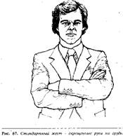 Замаскированные жесты, связанные со скрещиванием рук являются очень утонченными, усовершенствованными жестами, к которым прибегают люди, постоянно находящиеся в центре внимания. К этой категории людей относятся политические деятели, коммивояжеры, телевизионные комментаторы и другие, кто не хочет, чтобы их зрители заметили их неуверенность или нервозность. Для проделывания этого жеста рука движется поперек тела по направлению к другой руке, но вместо того, чтобы ухватиться за эту руку, она прикасается к сумочке, браслету, часам, запонкам или какому-нибудь другому предмету, находящемуся на противоположной руке или рядом с ней. И снова образуется барьер и утверждается состояние безопасности. Когда были модными запонки, то часто можно было увидеть, как мужчины поправляли их в тот момент, как им приходилось на виду у всех проходить через комнату или танцевальный зал. Сейчас запонки вышли из моды и мужчины поправляют ремешок часов, проверяют содержимое своего портмоне, потирают руки, играют пуговицей на манжете или используют любой другой предлог, позволяющий им держать руки поперек тела.