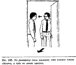 На рис. изображены два человека, разговаривающие на ходу, проходя в двери: человек слева пытается задержать внимание собеседника, но тот хочет продолжать свое движение в том направлении, куда указывает его тело, хотя его голова повернута и свидетельствует о его заинтересованности. Но только тогда, когда человек справа телом повернется к другому, может состояться беседа взаимозаинтересованных людей.