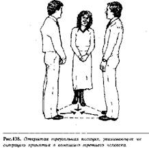 Образование треугольника приглашает третьего человека, равного в социальном отношении, присоединиться к их разговору. Если в компанию принимается четвертый человек,, то образуется квадрат, а если пятый, то формируются - два треугольника или круг. Треугольная позиция как открытого, так и закрытого типа может использоваться для выражения принятия или непринятия человека в компанию.