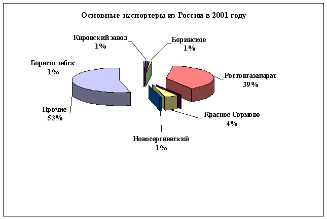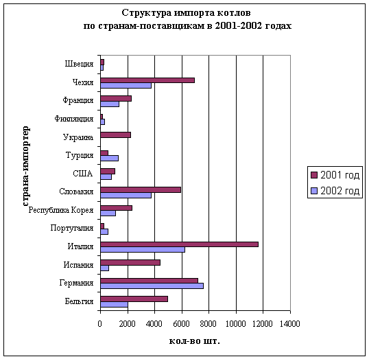 В 2001 году российскими предприятиями было экспортировано почти 10 тыс. единиц котлов на общую сумму 1,5 млн. долларов, а в I квартале 2002 года 6,5 тыс. единиц на общую сумму более 1 млн. долларов. Основная часть российского экспорта идет в Казахстан, Молдавию, Монголию, на Украину и в Латвию. Ниже представлена структура экспорта котлов российскими производителями в 2001 году на основе таможенной статистики.