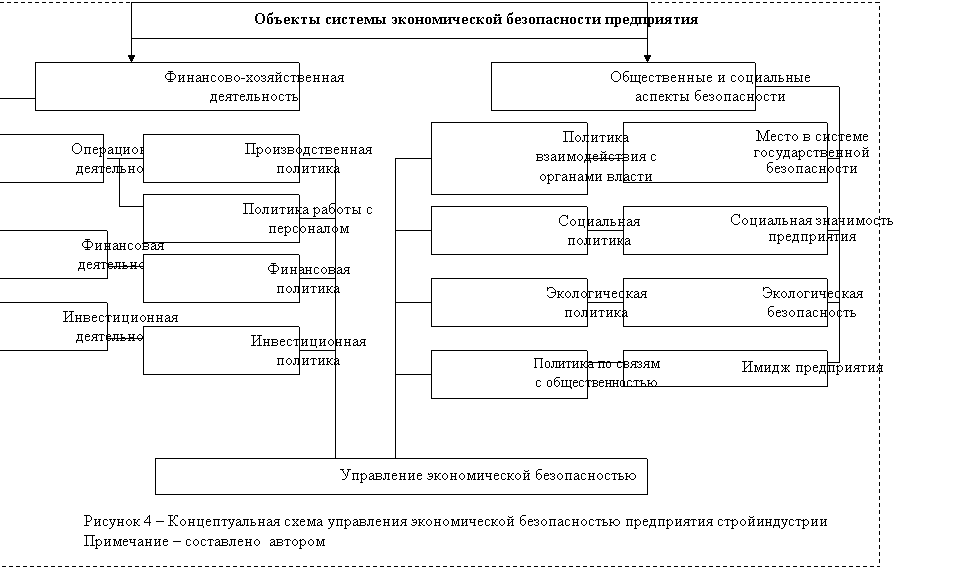 Концепция системы экономической безопасности предприятия строительной индустрии, на наш взгляд, должна основываться на четком определении комплекса составляющих ее элементов. В основу этого комплекса может быть положена система объектов экономической безопасности предприятия, включенная в концептуальную схему управления экономической безопасностью предприятия, которая приведена на рисунке 4.