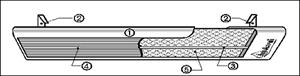 Обогреватель состоит из прямоугольного металлического корпуса покрытого жаростойкой краской (1), с элементами крепления к потолку (2). Низкотемпературный ТЭН (3) вмонтирован в теплоизлучающую пластину — высокоточный анодированный профиль из алюминия (4), высококачественный теплоизолятор (5).