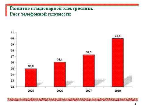 В годах будут продолжены работы по развитию местной телефонной сети с учетом задач, предусмотренных Программой развития связи в Республике Беларусь на годы, Государственной программой инновационного развития Республики Беларусь на годы. При этом первоочередное внимание будет уделено удовлетворению имеющихся заявлений на установку телефона, а также модернизации морально и физически устаревшей коммутационной техники, в результате чего предполагается повысить качество оказываемых услуг электросвязи населению. Планируется дальнейшее развитие сети беспроводного абонентского доступа (WLL) к сети стационарной электросвязи. До 2010 года запланировано построить 10 новых радиотелевизионных передающих станций.