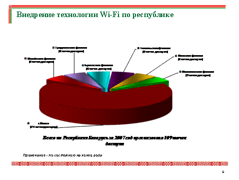 В Минске и областных центрах в местах общественно-политической и деловой активности организован беспроводной доступ к сети Интернет с использованием оборудования стандарта Wi-Fi. Строительство таких сетей будет продолжено.