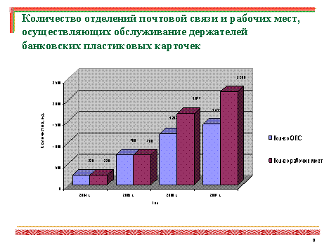 Во всех отделениях почтовой связи организован прием электронных денежных переводов. В 2200 отделениях почтовой связи внедрены услуги с применением считывателей банковских пластиковых карточек. Эксплуатируется 230 единиц платежно-справочных терминалов, работающих в режиме самообслуживания. Организовано 3372 автоматизированных рабочих места операторов почтовой связи с возможностью работы со считывателями банковских пластиковых карточек и сканерами штриховых кодов.
