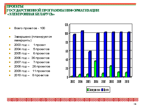 Начиная с 2007 года, в рамках семи общесистемных проектов Программы создается информационно-коммуникационная инфраструктура, ориентированная, в первую очередь, на формирование системы оказания государственных информационных услуг и разрабатываются информационные системы, реализующие бизнес-логику отработки административных процедур взаимодействия государственных органов и потребителей "одно окно". Техническими решениями проектов предусматривается максимальное использование сетевой телекоммуникационной инфраструктуры, в первую очередь национальной сети передачи данных и возможностей центра обработки данных РУП "Белтелеком".