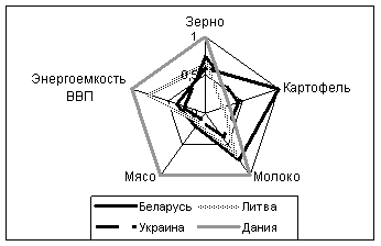 В таблице 8.1.2 определены наиболее высокие коэффициенты по основным видам продовольствия (зерно, молоко, мясо), принимаемые за единицу (1,00) в качестве нормированного эквивалента при расчете коэффициентов в других странах (по энергоемкости ВВП за единицу принимаются наименьшие значения коэффициентов) для построения радарной диаграммы (рисунок 8.1.1).