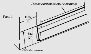 В нижней точке конструкции начертите опорную линию так, чтобы припуск на ширину угловой панели составил 10 см (4 дюйма) (см. рис. 1). Закрепите опорную полосу гвоздями на расстоянии 30 см (12 дюймов). Важно: опорная полоса должна быть расположена строго горизонтально.