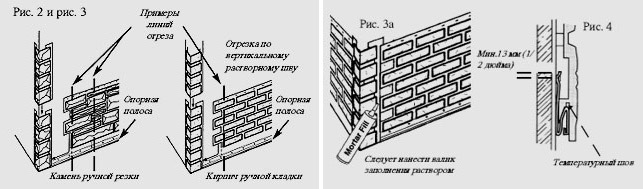 Главное правило: при монтаже нужно двигаться слева направо. Зафиксируйте первый угол каменной или кирпичной кладки ниже нижней стороны отчерченной ранее полосы приблизительно на 3 мм (0.8 дюйма). Сдвиньте начальную панель влево, уперев её в угол (см. рис. 2 и 3). Зафиксируйте эту панель на опорной полосе, учитывая расположение монтажных штырей. Не уменьшайте температурные швы (см. рис 4), в противном случае возможно коробление панелей. Затем переместите панель влево за 2 мм (1/16 дюйма) от угла. В случае монтажа панелей кирпичной кладки необходимо соединить линию горизонтального растворного шва с углом. Каменная кладка, в отличие от кирпичной, имеет произвольный рисунок, но и здесь нужно следить, чтобы растворные швы не совпадали с углом. При подгонке панели и угла необходимо нанести валик растворного заполнения (см. рис. За).