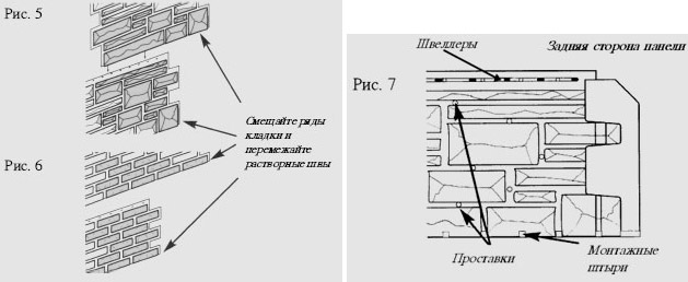 Забейте гвозди через подложку так, чтобы шляпки слегка касались поверхности панели. Следующую панель нужно завести в опорную полосу и приблизить её вплотную к первой закреплённой панели. Внимательно повторите этапы 1-3. Чтобы получить естественный рисунок каменной или кирпичной кладки, необходимо смещать каждую следующую панель примерно на 20 см (8 дюймов) (см. рис. 5 и 6). Внимание: нельзя устанавливать панели, давя верхней деталью на нижнюю. Панели нужно легко фиксировать на штыри, без нажима, в то же время следя за их надёжной фиксацией. Совет: при монтаже приподнимайте правую сторону панели, это облегчит работу.