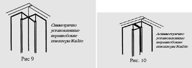 Для подгонки внутренних углов рекомендуем использовать неравнобокие швеллеры Nailite, либо можно тщательно разметить и отрезать панель и заделать угол. Перед установкой нужно выровнять угол алюминиевой или винипластовой лентой (см. рис. 9 и 10).