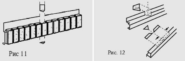 Для установки на углах отделку карниза Nailite можно нагреть и гнуть, придавая любые формы. В отделке карниза выполните призматический надрез в месте необходимого сгиба (см. рис. 11). Сделайте нужные надрезы перед установкой карниза на наружном углу (см. рис. 12).